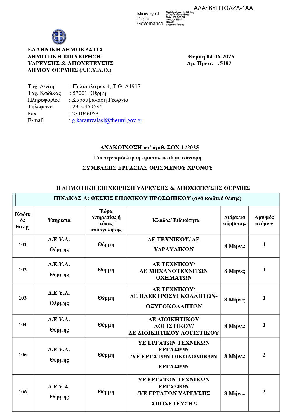 Κατεβάστε εδώ την Ανακοίνωση ΣΟΧ 1/2025 Σύμβασης Εργασίας Ορισμένου Χρόνου