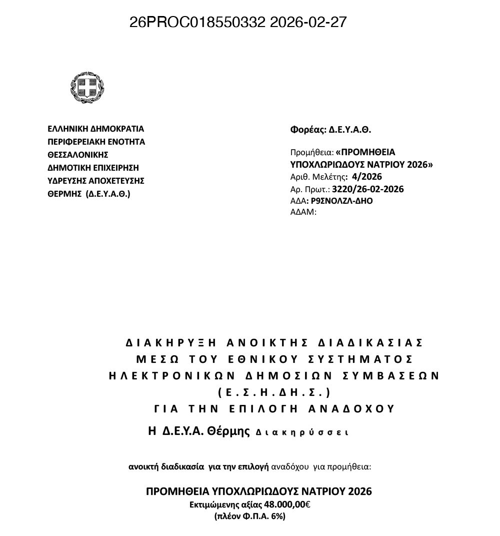 Κατεβάστε εδώ την ΔΙΑΚΗΡΥΞΗ “ΠΡΟΜΗΘΕΙΑ ΥΠΟΧΛΩΡΙΩΔΟΥΣ ΝΑΤΡΙΟΥ 2026”