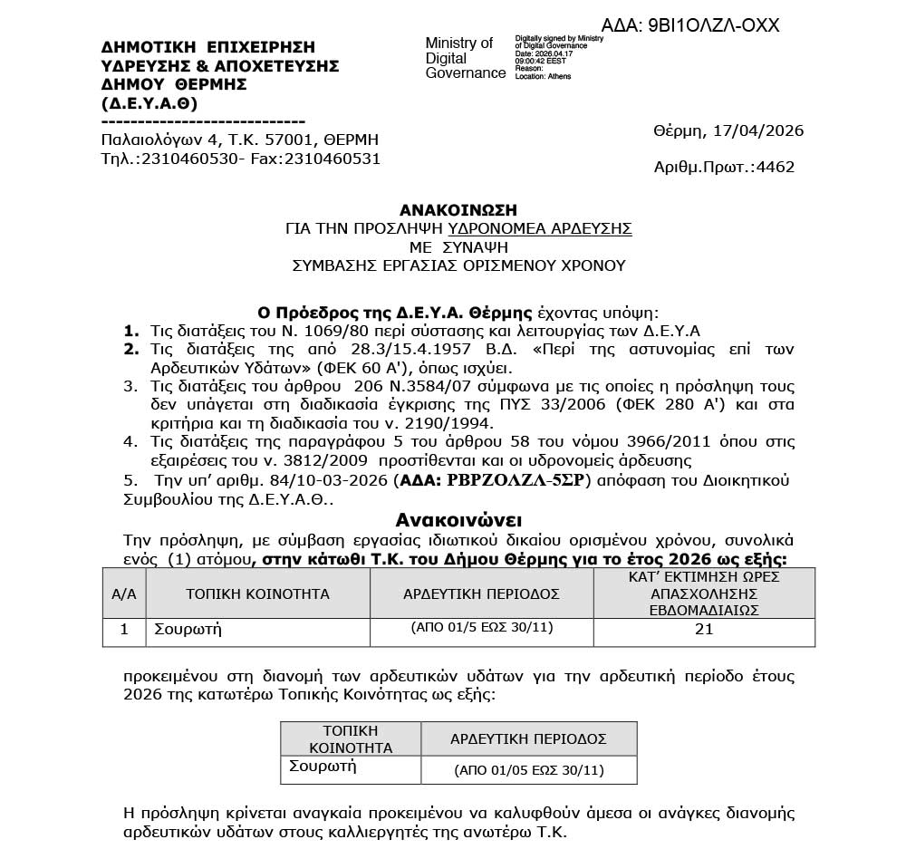 Κατεβάστε εδώ την Ανακοίνωση για Πρόσληψη Υδρονομέων Άρδευσης
